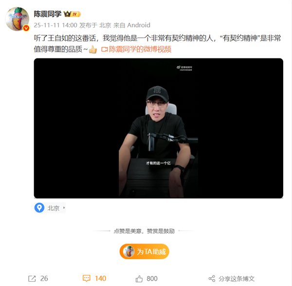 快科技11月13日消息,日前,博主“@ 陈震同学”转发了一段王自如的访谈视频,并配文:听了王自如的这番话,我觉得他是一个非常有契约精神的人,“有契约精神”是非常值得尊重的品质。