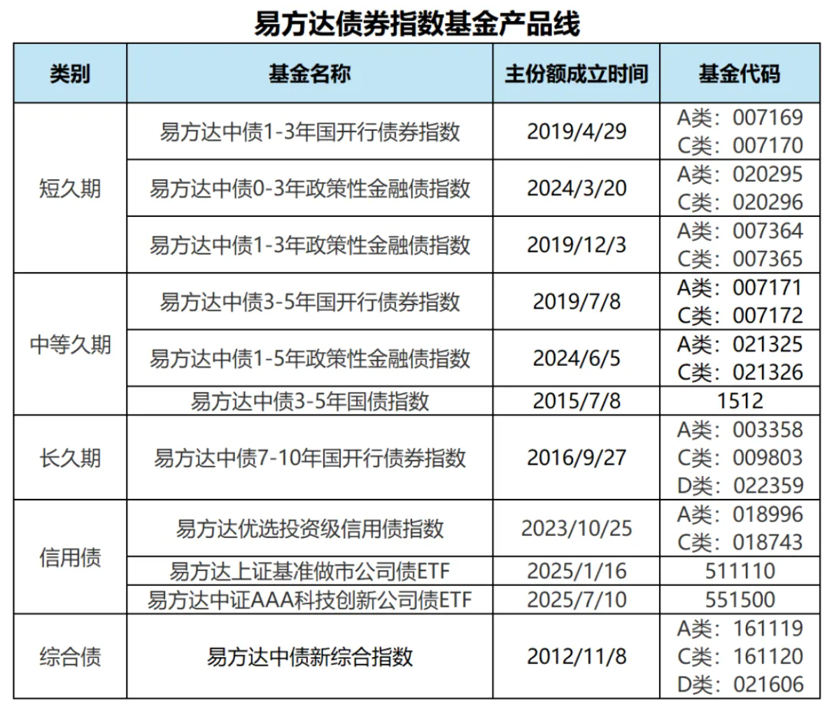 目前,经过十余年耕耘布局,易方达旗下已有利率债、信用债及综合债等11只债券指数产品,逐渐实现多品种、全期限覆盖,且均已实现“管理费0.15%/年、托管费0.05%/年”的低费率。