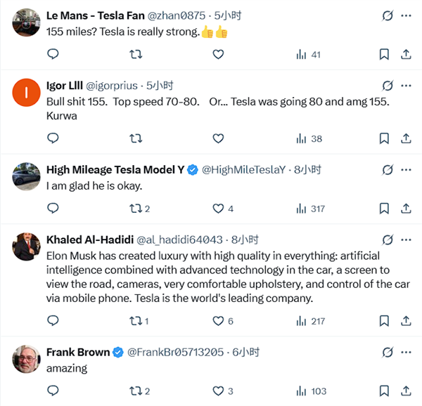 这条帖子引发了非常多的关注,评论区很多网友表达了对特斯拉安全性的称赞,还有人庆幸车主无碍,不过也有人就事件真实性表达了质疑,认为从撞击痕迹看,根本达不到155英里/时。