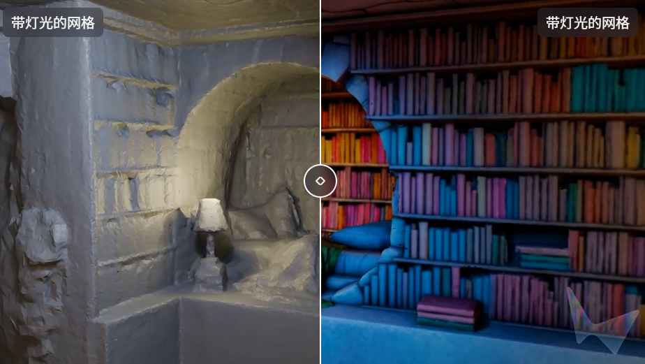 Gaussian Splat 是呈现 Marble 世界的最高保真方式,它将 3D 场景表示为大量半透明粒子,能输出极细腻的空间细节。通过 Spark —— 一款与 THREE.js 集成的开源跨平台渲染器,你甚至可以在浏览器中直接渲染这些高斯粒子场景。