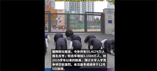 还有一个有趣的是一幕,韩国高考开始前,高二学生跪在地上行大礼,祝前辈们考试顺利上个好大学....