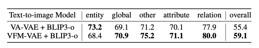 这些结果表明,VFM-VAE 不仅在潜空间扩散阶段表现出稳健语义对齐,也能在跨模态生成中有效传递这种一致性,形成从「视觉理解」到「图像生成」的闭环。