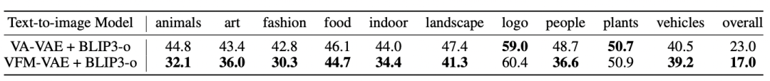 表 3:不同 Tokenizer 与 BLIP3-o 的文本生成图像结果(MJHQ-30K),数值越低,代表对应类别下生成真实性越高。