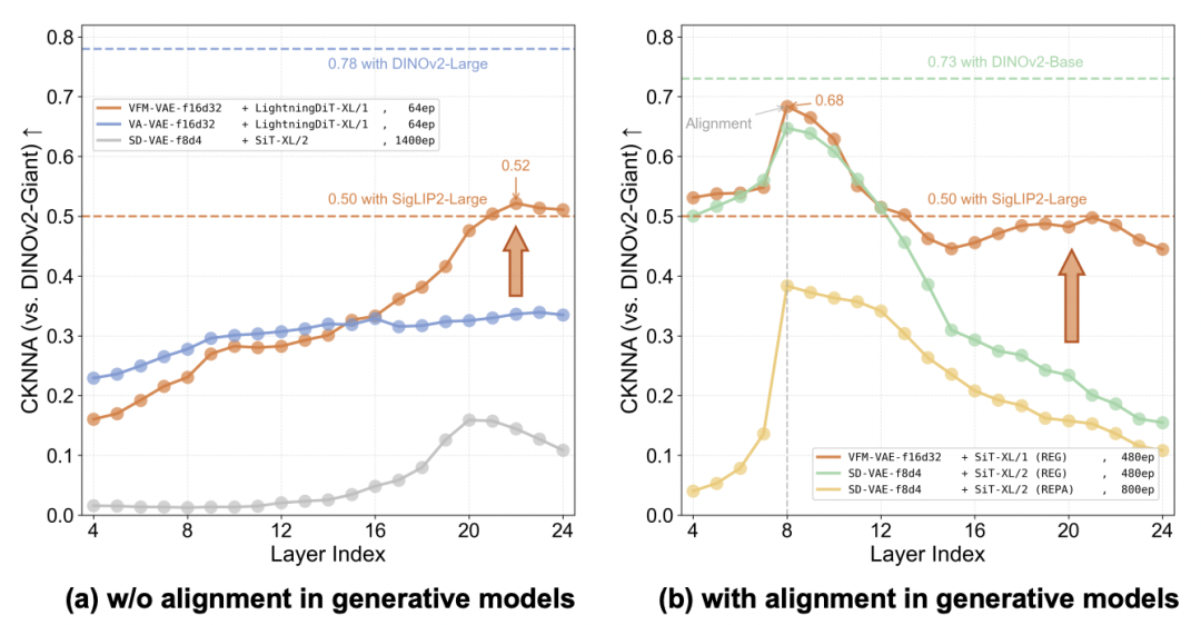 图 4:左侧展示了不同分词器结合生成模型时,在未引入显式对齐机制下各层特征与基础视觉模型特征的对齐情况;右侧对比了结合显式对齐的 VFM-VAE 与仅采用显式对齐的生成模型在层间特征与基础视觉模型特征对齐上的差异。