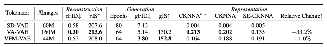 表 1:不同 Tokenizer 与视觉基础模型的对齐质量,以及对应的重建、生成能力对比。CKNNA* 是与 DINOv2-Giant 统一计算;其余 CKNNA 是与各自的视觉基础模型计算,SD-VAE 默认与 DINOv2-Large 计算。