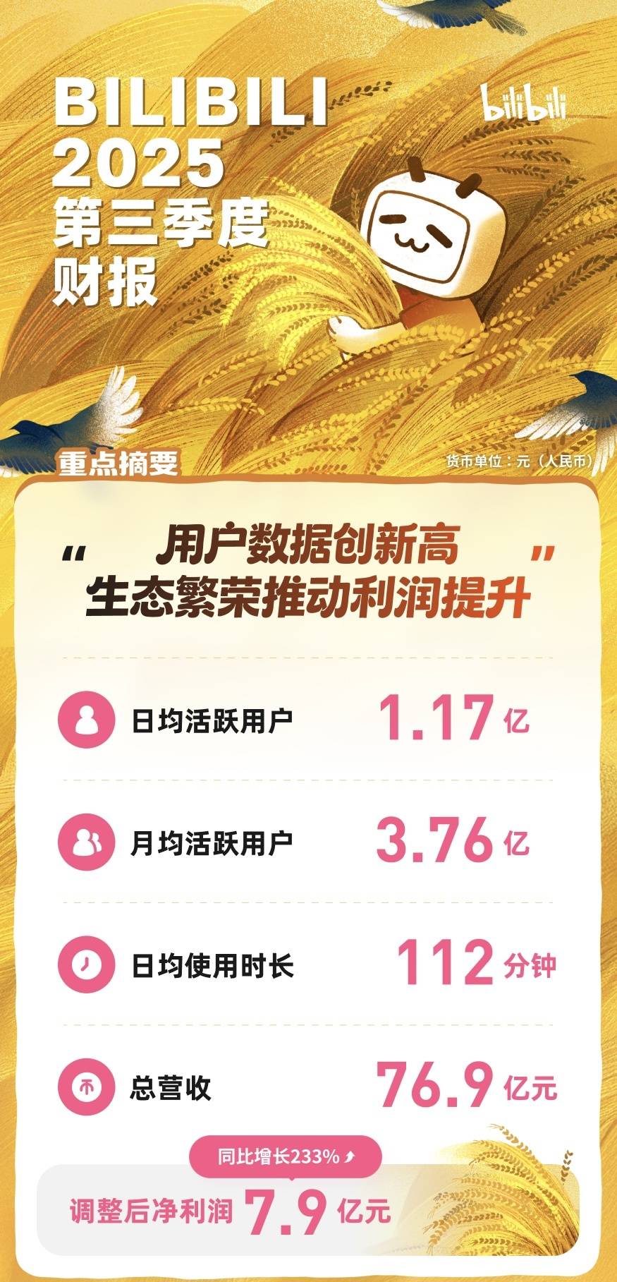2025年,B站社区实现了加速增长,多项数据创下历史新高。三季度日均活跃用户达1.17亿,同比增长9%;月均活跃用户达3.76亿,同比增长8%;日均使用时长也增至112分钟,同比提升6分钟。