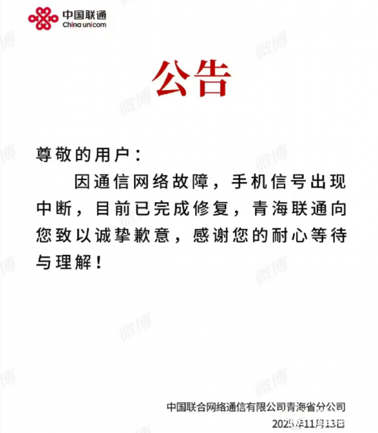 记者注意到,就在13日21:38分,青海联通官方微博发布公告称:因通信网络故障,手机信号出现中断,目前已完成修复,青海联通向您致以诚挚歉意,感谢您的耐心等待与理解!