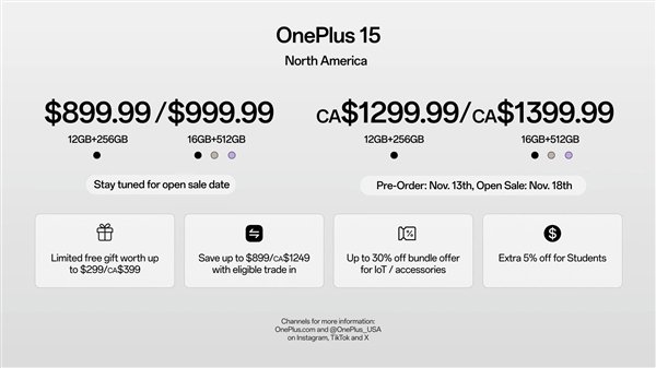 值得注意的是,因美国政府停摆,一加15在美推迟销售,消费者需要等一等。一加表示,与所有智能手机厂商一样,一加设备在美国销售前需获得FCC的认证,受美国政府停摆影响,设备认证流程出现延迟,因此一加15在美国地区将完成认证后上市销售。