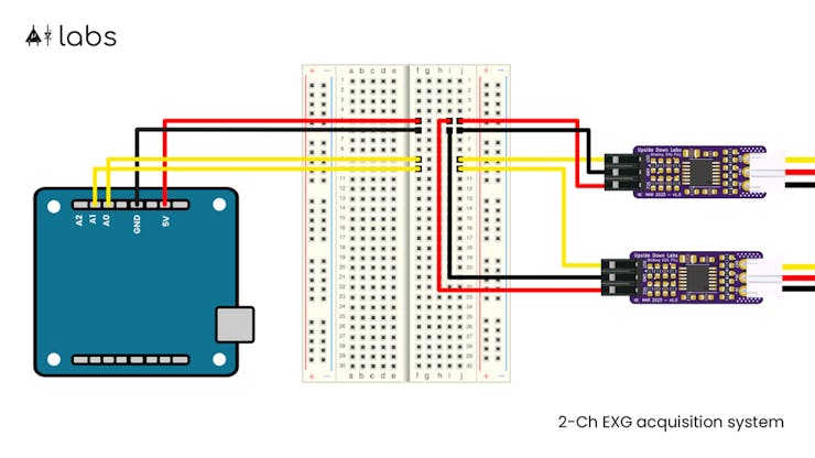两块 EXG Pill 分别接到不同模拟通道(A0、A1)。