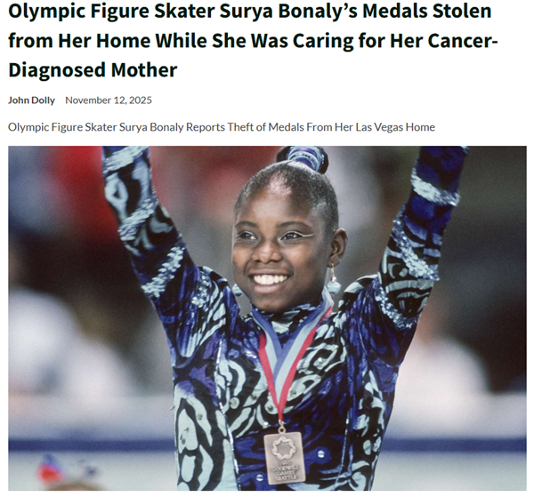 快科技11月14日消息,海外媒体报道,日前,法国前奥运花样滑冰运动员苏瑞亚·博纳利于美国拉斯维加斯的家中遭窃贼闯入,职业生涯斩获的所有奖牌均被偷走。