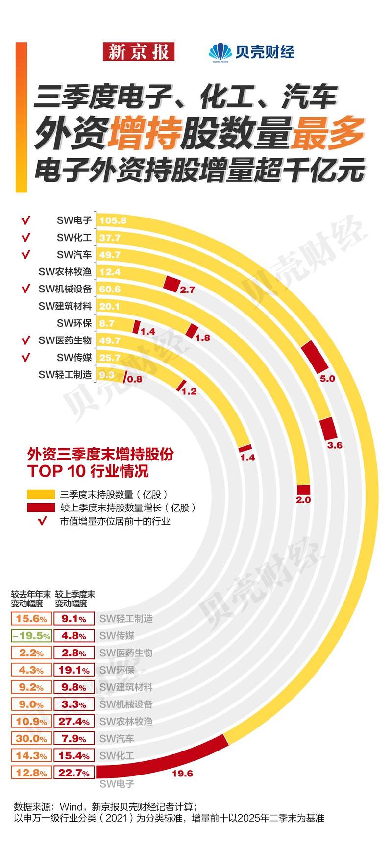 对比二季度末,电子、化工、汽车是外资增持股数最多的三个行业,增持股数19.6亿股、5.04亿股、3.62亿股,对应涨幅为12.8%、14.3%、30.0%。新京报贝壳财经记者对比发现,电子、汽车、机械设备、医药生物仍是外资持仓总量前十的行业,在总量与增量上均表现突出,体现了外资对制造业和科技创新相关领域的持续偏好。