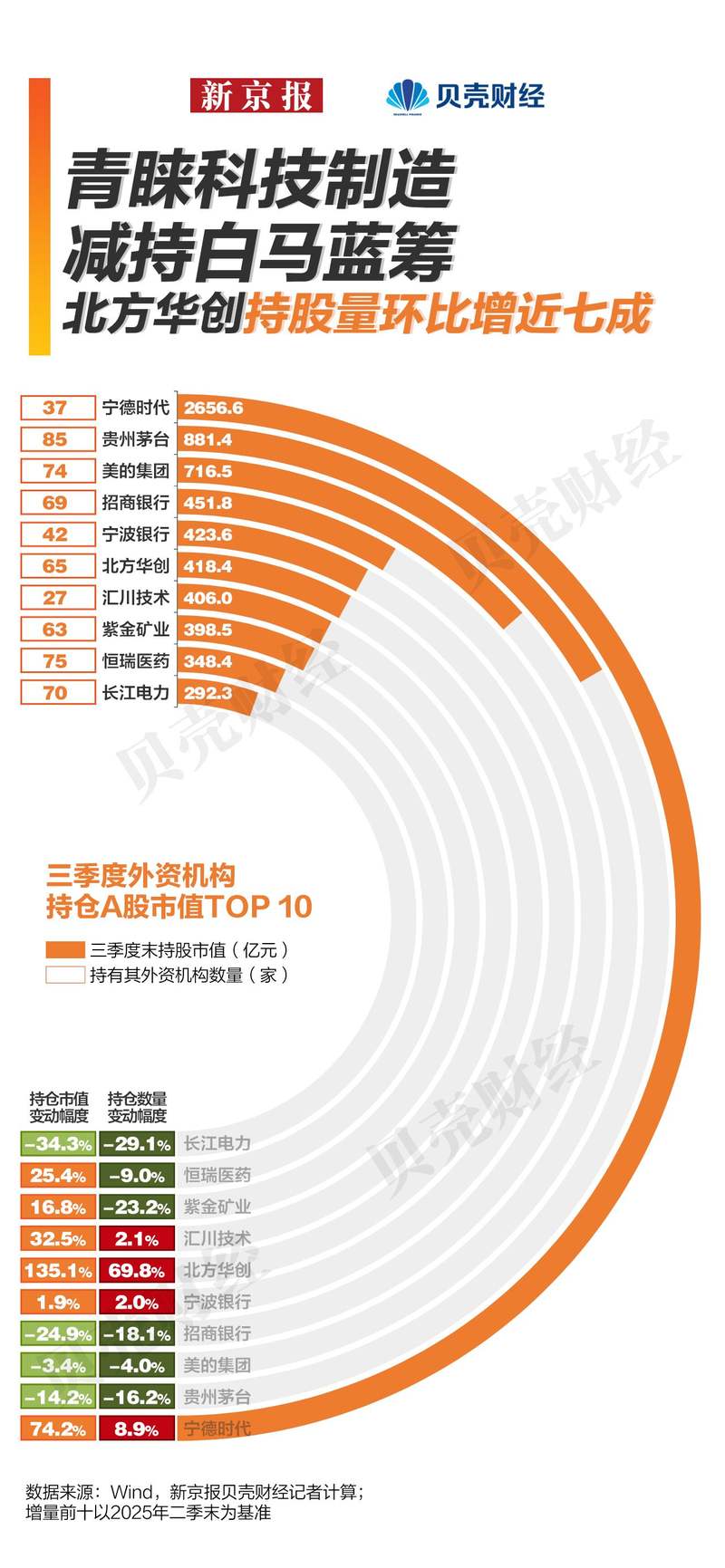 从持股市值来看,外资持有宁德时代6.6亿股,三季度末市值为2656.59亿元,远超其余持有个股的市值。与二季度末相比,外资持有宁德时代股票数增长8.9%,市值增幅达74.2%。北方华创表现同样亮眼,外资持股数量环比增长近70%,市值上升135%,成为外资持有前十大市值个股中加仓力度最大的科技股。