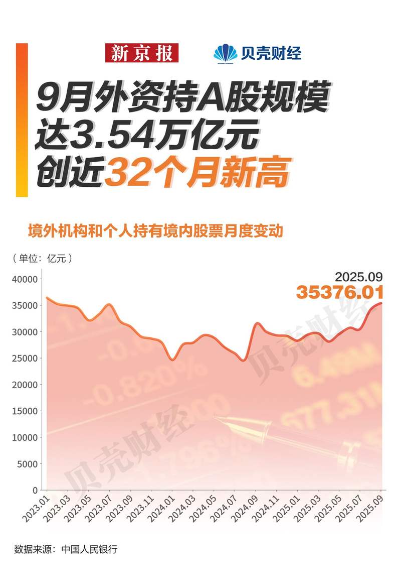 这并非外资持股的全部资金。根据央行披露数据,今年9月末境外机构和个人持有境内股票3.54万亿元,连续四个月站上3万亿元,创下近32个月新高,外资整体加配A股趋势明显。