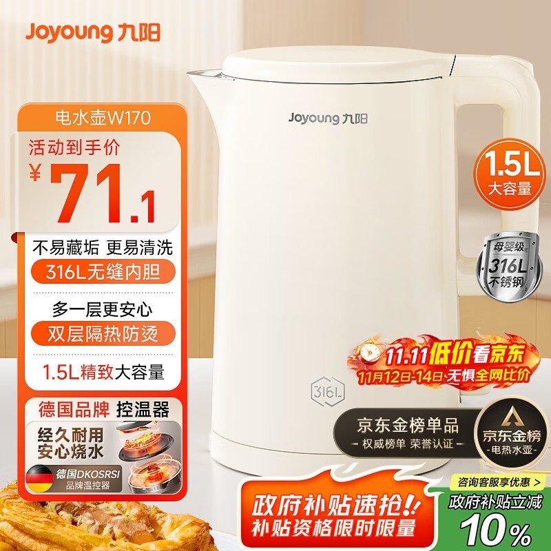 九阳1.5L电热水壶59.49元
