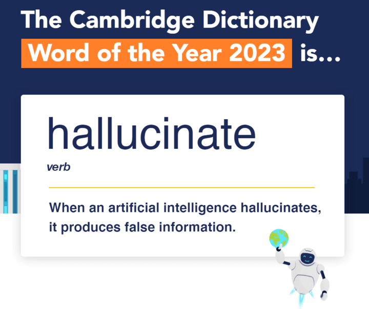 英国剑桥词典则把目光投向了「hallucinate」幻觉。剑桥将其评为 2023 年的年度词汇之一,原因在于这个心理学动词在当年获得了全新的技术含义。