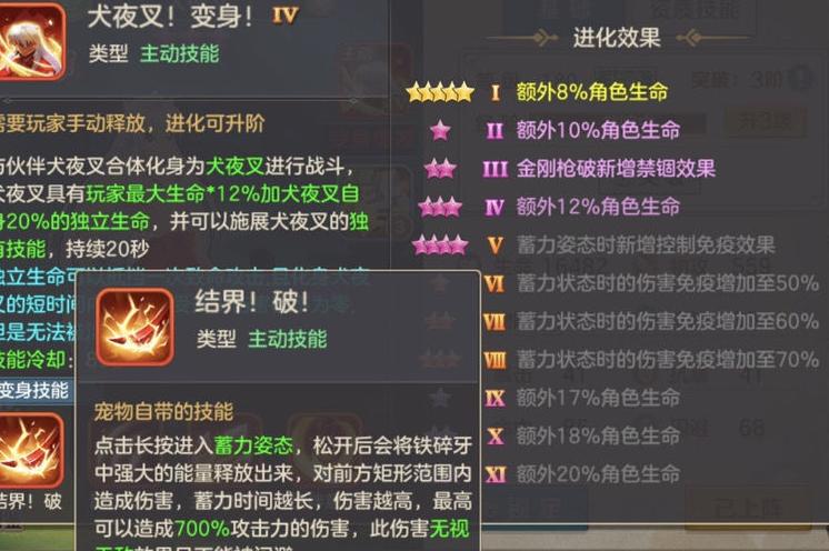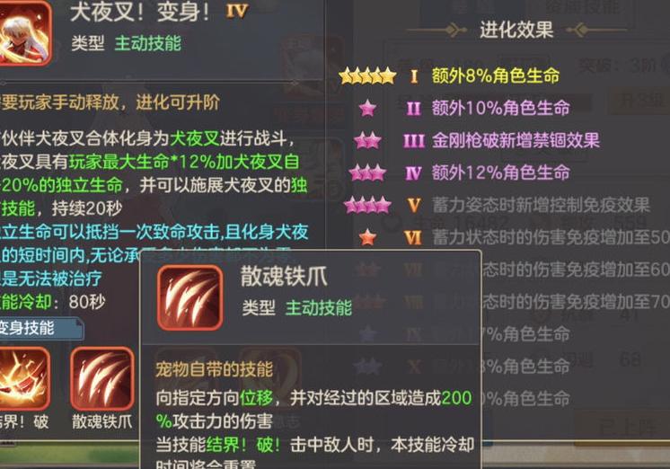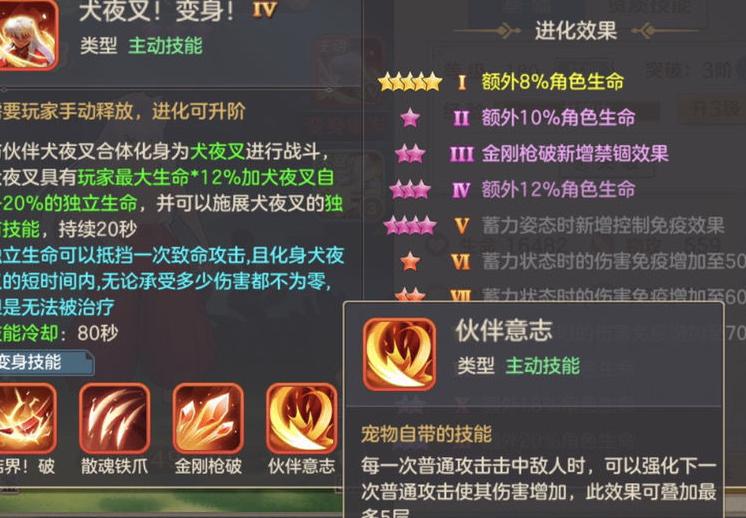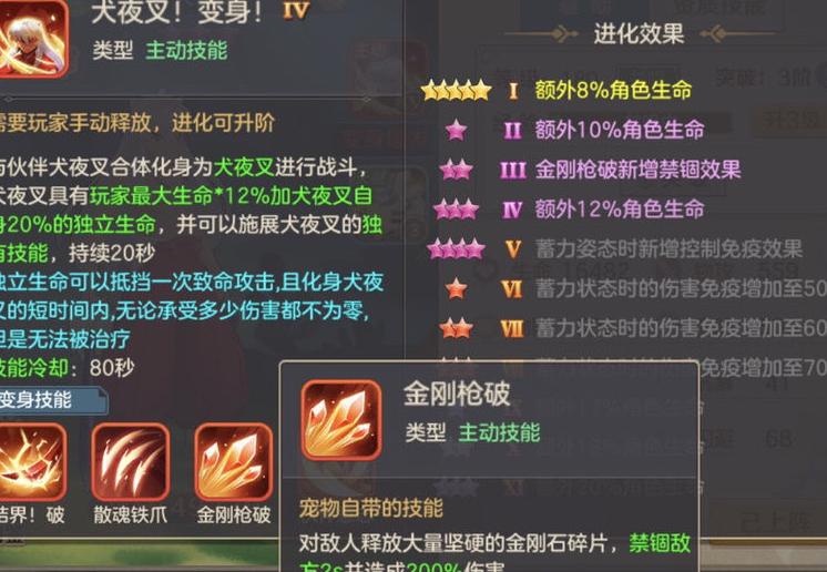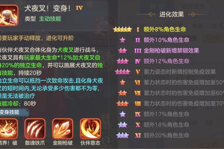 在培养方面,不少玩家关心如何提升星级。目前系统仅赠送一个升星材料,而伙伴升星消耗资源较多,尤其活动结束后需用钻石购买魂玉,成本较高。普通玩家建议升至10星即可,氪金玩家可追求15星。犬夜叉虽为输出型宠物,但其生命资质极为出色,放置在辅助星阵首位时能带来显著的生命加成,这是它最突出的优势所在,值得重点培养。