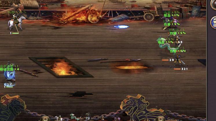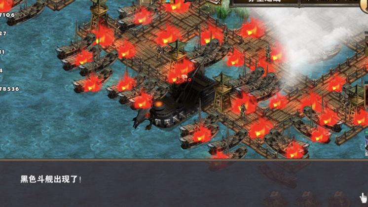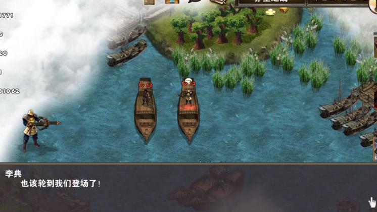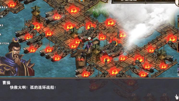 从码头下水后向上推进,逐一击败前方两个Boss。此阶段由刘备辅助、诸葛亮主输出,战斗过程较为轻松。之后向左行进,注意在诸葛亮与刘备战斗间隙安排回蓝休息。不久后,敌将曹洪将朝大型楼船方向移动,务必严防死守,一旦楼船被摧毁即判定游戏失败。诸葛亮与刘备及时赶至,可迅速击溃曹洪。
