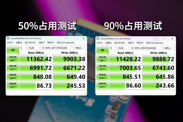 样品实测显示,CDM 1GB大小连续读写速度可达11.3GB/s、9.9GB/s,远超旗舰级PCIe 4.0 SSD。