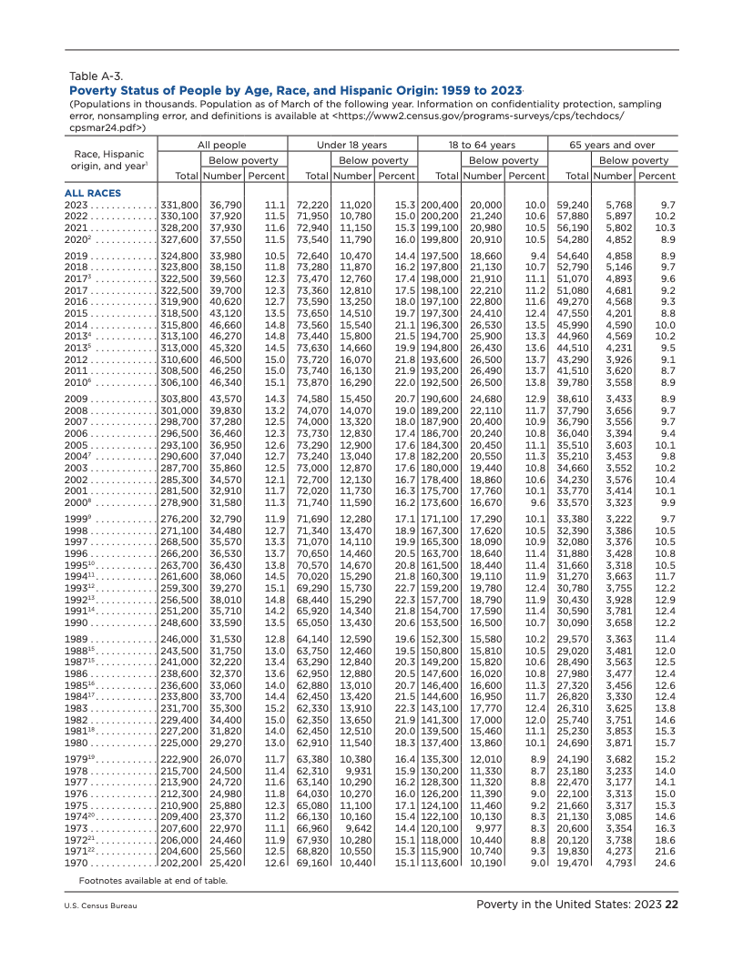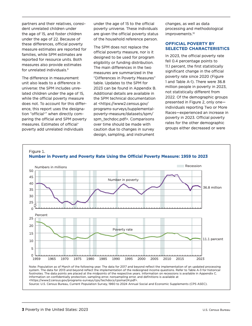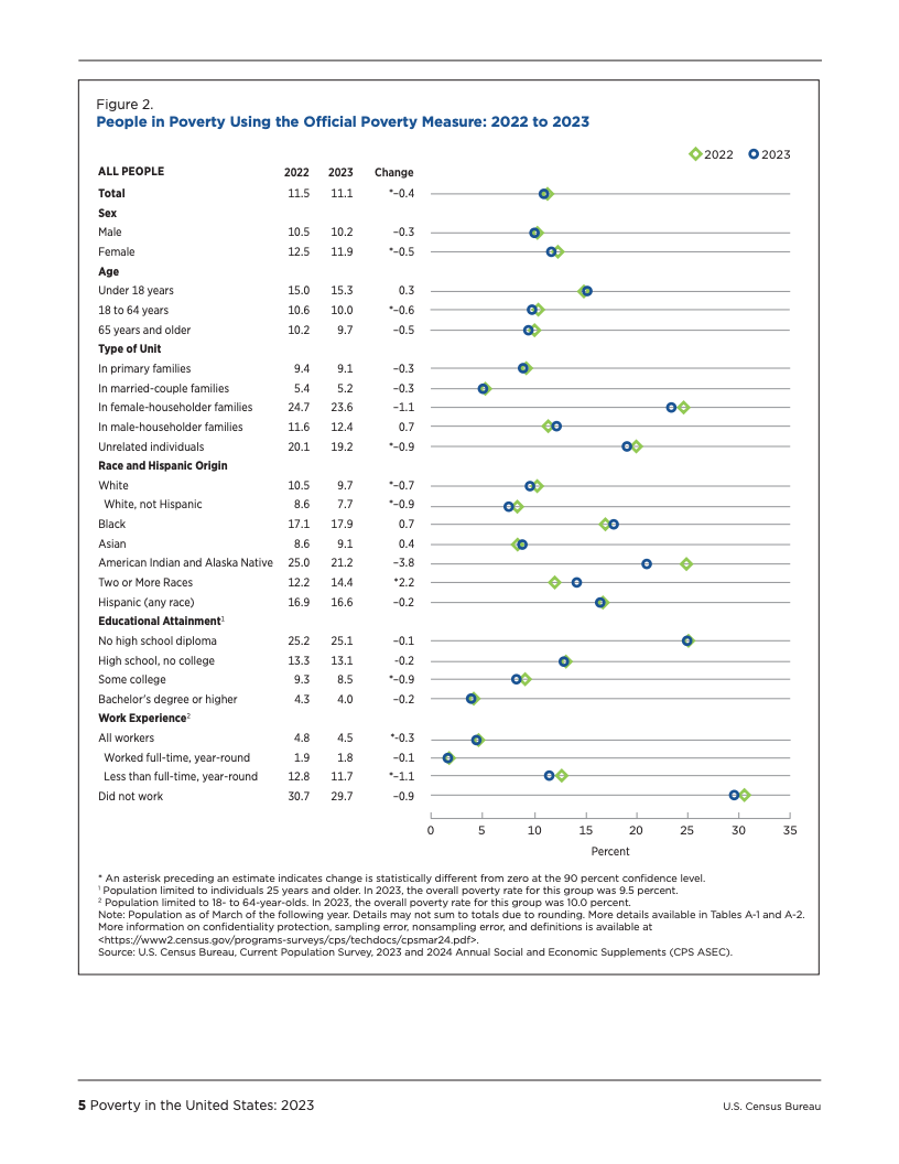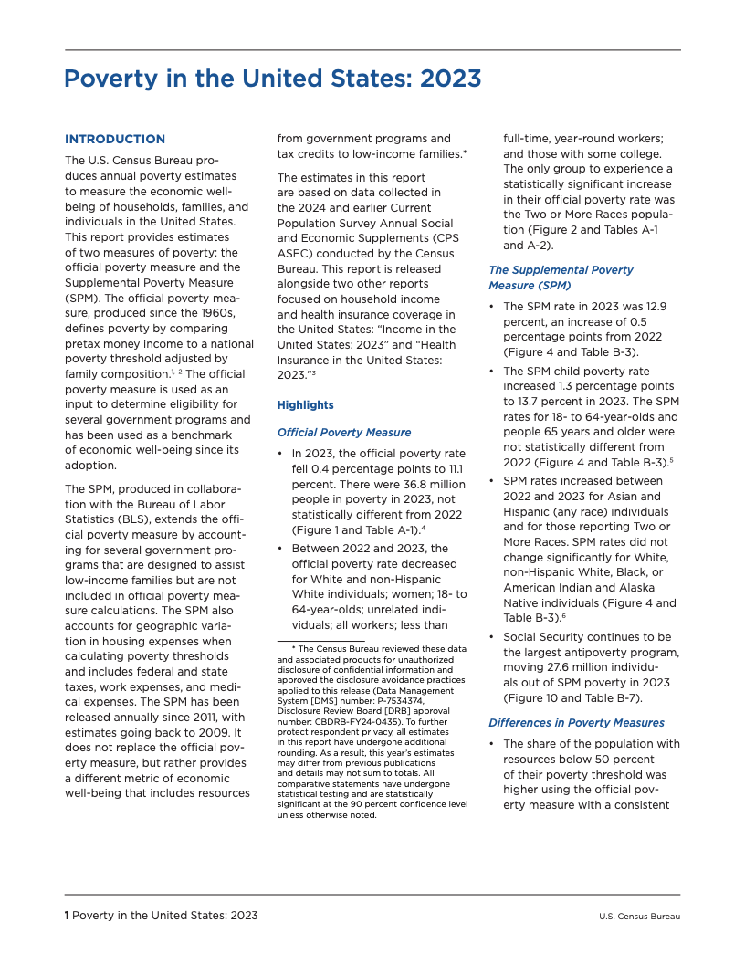 根据美国人口普查局发布的最新数据,2023年美国的贫困状况呈现出复杂而分化的图景。官方贫困率(OPM)从2022年的11.5%降至11.1%,贫困人口数量为3680万,与前一年相比无显著统计差异。这是自2020年以来官方贫困率首次出现显著变化,主要受益于白人、非西班牙裔白人以及18至64岁工作年龄段人口的贫困状况改善。然而,这一总体趋势并未覆盖所有群体,例如报告为两个或更多种族的人口贫困率反而有所上升。