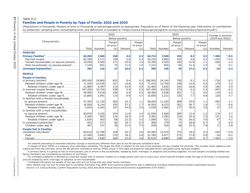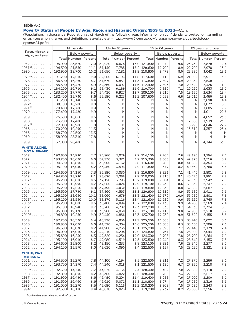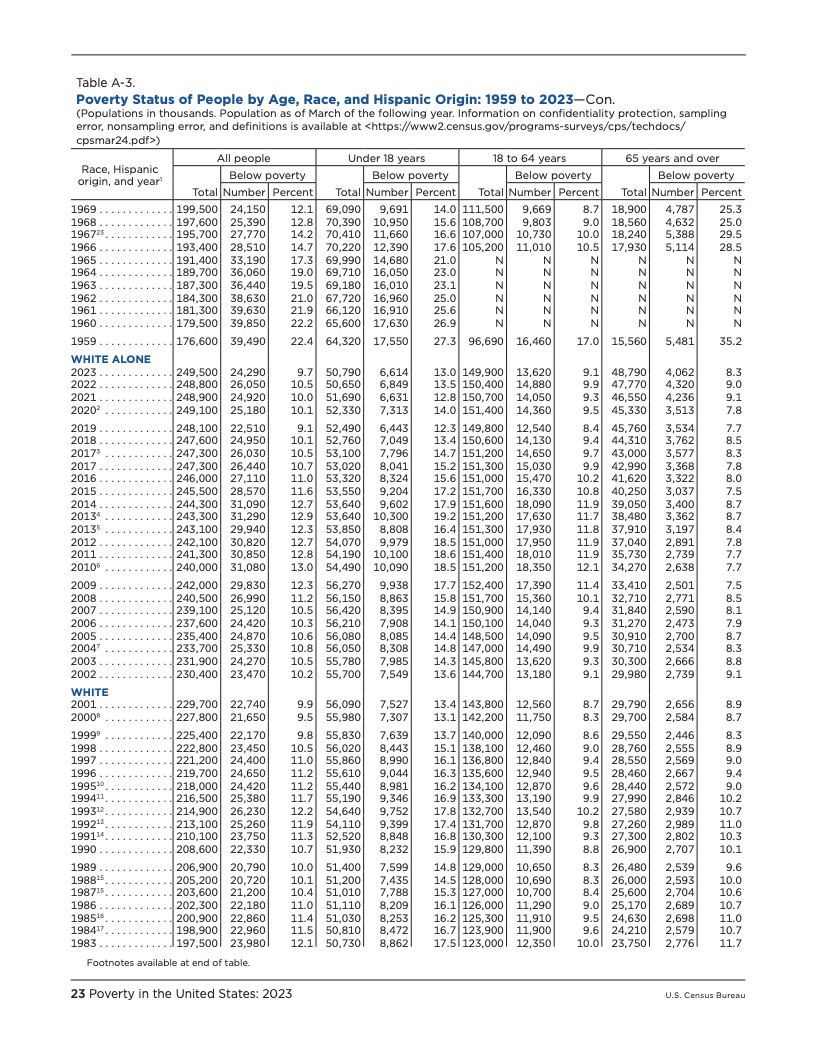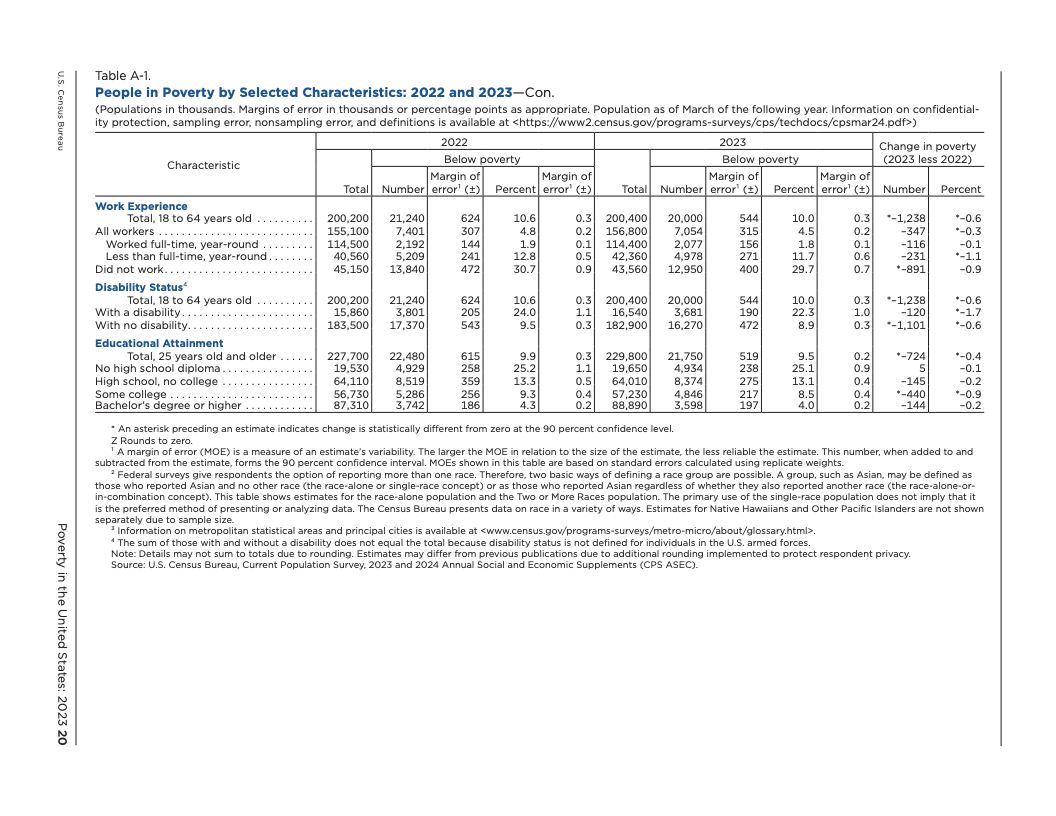 根据美国人口普查局发布的最新数据,2023年美国的贫困状况呈现出复杂而分化的图景。官方贫困率(OPM)从2022年的11.5%降至11.1%,贫困人口数量为3680万,与前一年相比无显著统计差异。这是自2020年以来官方贫困率首次出现显著变化,主要受益于白人、非西班牙裔白人以及18至64岁工作年龄段人口的贫困状况改善。然而,这一总体趋势并未覆盖所有群体,例如报告为两个或更多种族的人口贫困率反而有所上升。