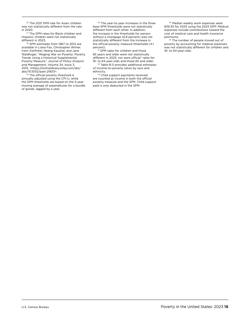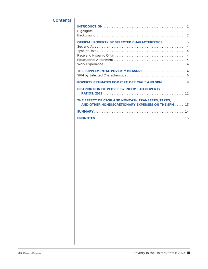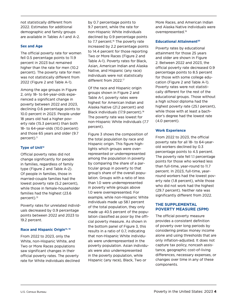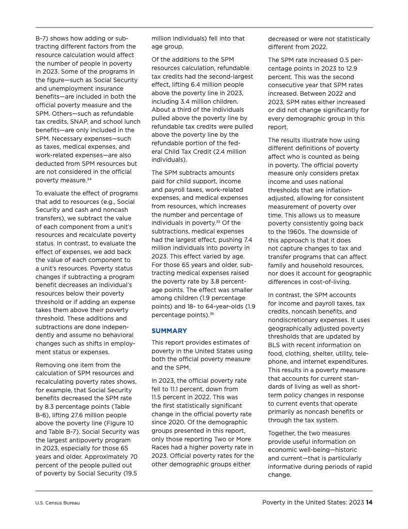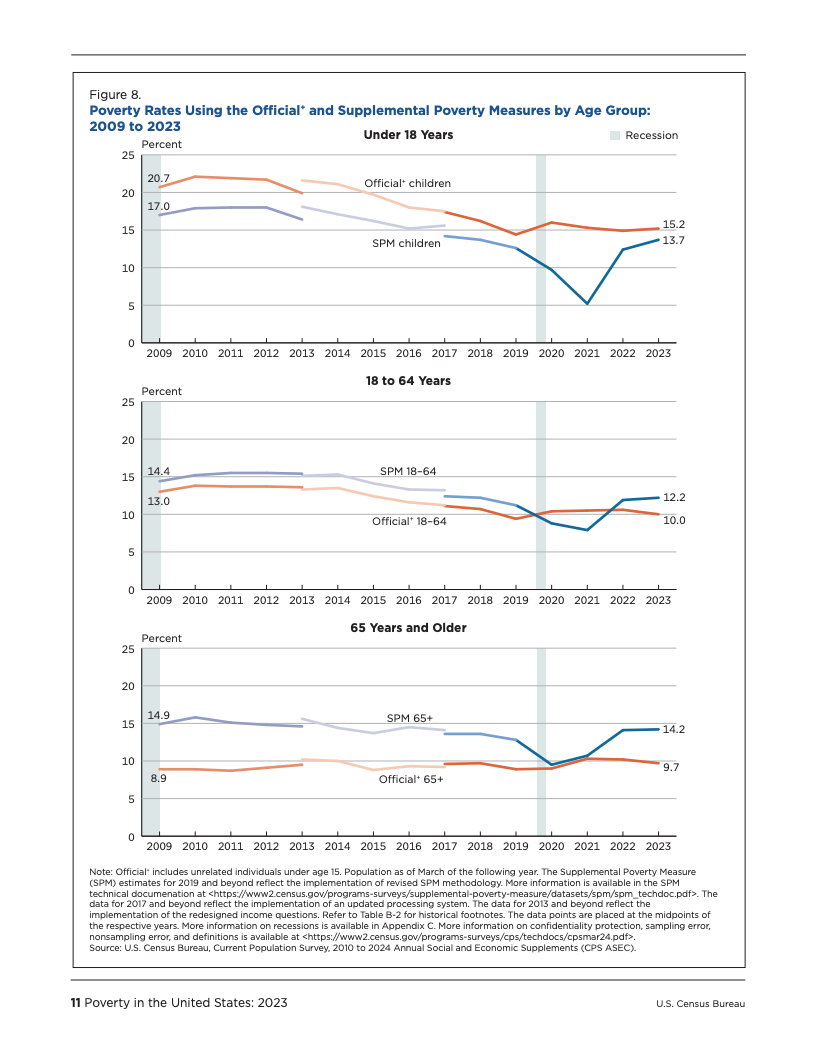 深入分析数据可以发现,政府的干预措施在缓解贫困方面扮演着至关重要的角色。社会保障(Social Security)是规模最大的反贫困项目,在2023年成功使2760万人摆脱了SPM贫困,其中约七成为65岁及以上的老年人。可退还的税收抵免政策,特别是儿童税收抵免,也帮助了640万人脱贫。另一方面,必要开支对家庭预算构成了沉重压力,仅医疗支出一项就导致740万人陷入SPM贫困,这在老年群体中尤为突出,医疗开支使该群体的贫困率增加了3.8个百分点。