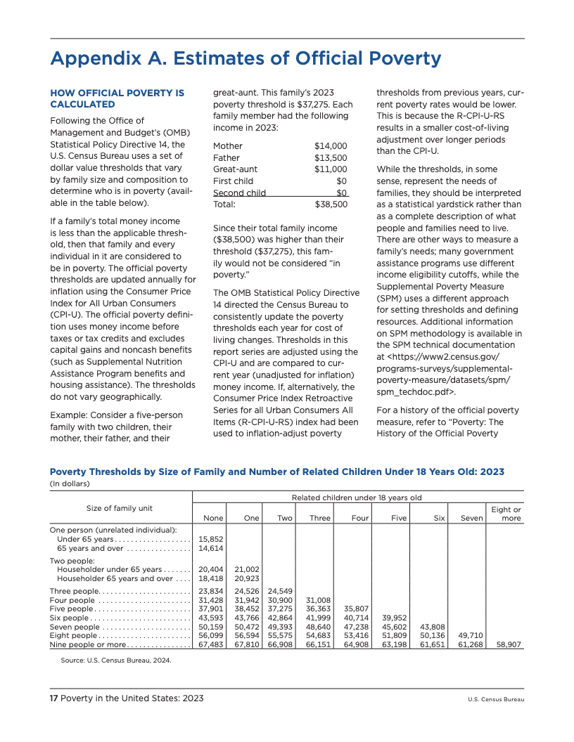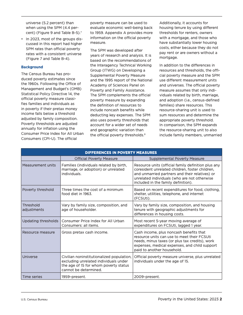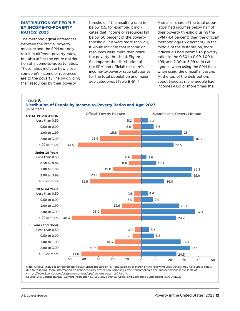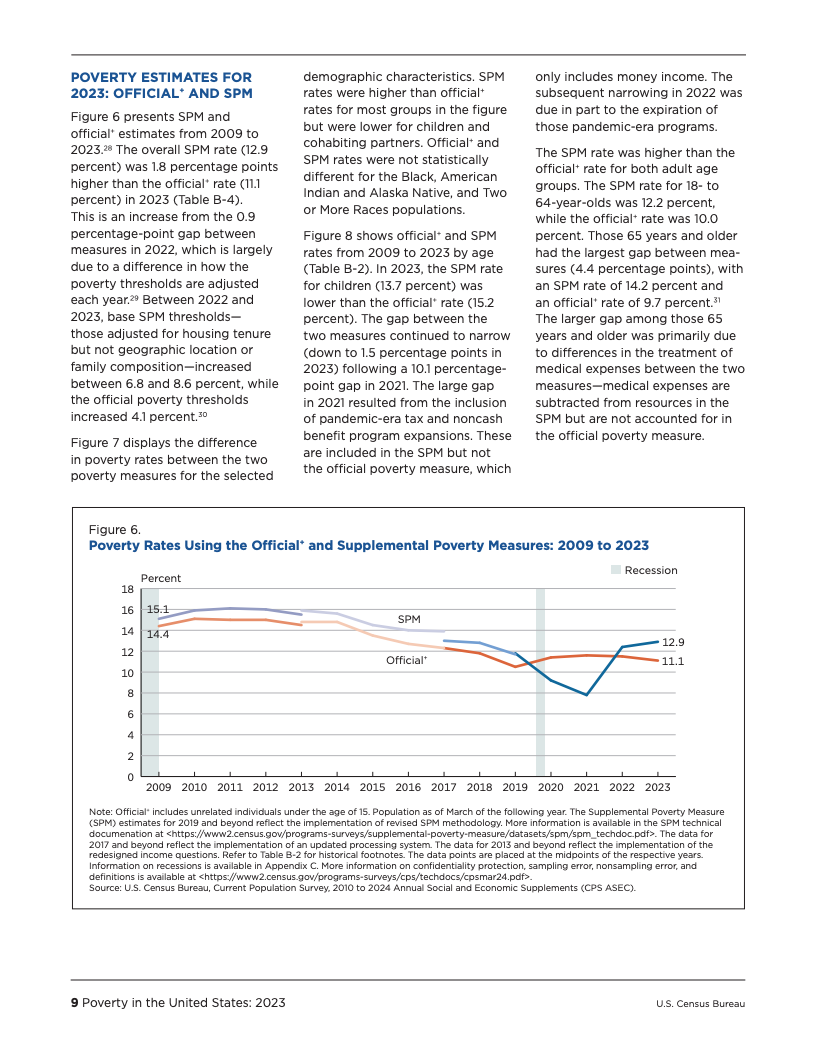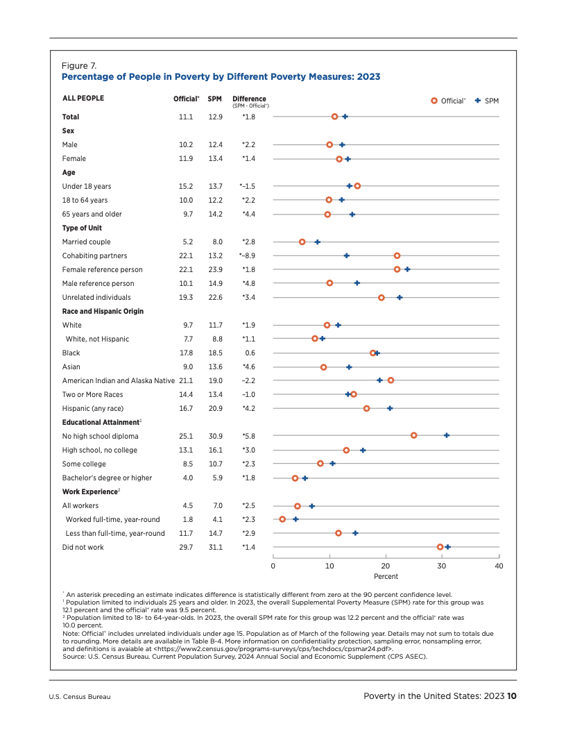 两大贫困衡量指标的走势分歧,凸显了不同统计口径对评估经济福祉的深刻影响。官方贫困率主要衡量税前现金收入,而SPM则纳入了非现金福利(如营养援助和住房补贴)和税收抵免,同时扣除了医疗和工作等必要开支。2023年,SPM贫困率比官方贫困率高出1.8个百分点,差距较2022年的0.9个百分点明显扩大。其主要原因在于,SPM的贫困门槛根据支出变化进行了更大幅度的上调,增幅在6.8%至8.6%之间,而官方贫困门槛的通胀调整幅度为4.1%。