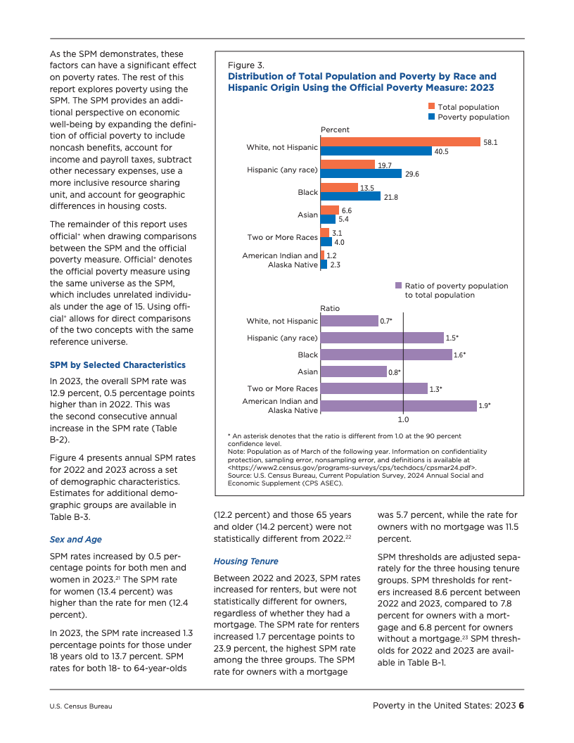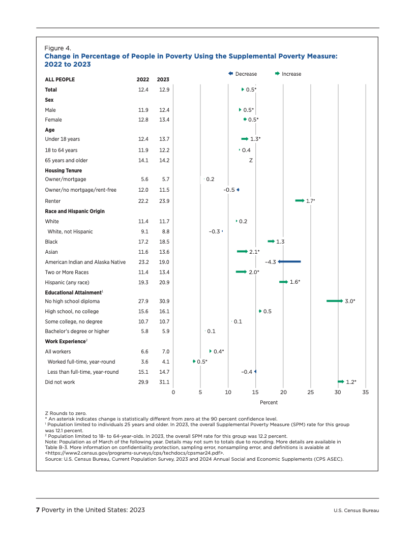 与官方贫困率的下降形成鲜明对比的是,补充贫困衡量指标(SPM)揭示了另一番景象。2023年,SPM贫困率上升至12.9%,较2022年的12.4%增加了0.5个百分点,这已是该指标连续第二年上升。尤其值得关注的是,儿童的SPM贫困率从12.4%大幅攀升至13.7%。亚裔和西班牙裔群体的SPM贫困率也显著增加。这一上升趋势反映了部分抗疫时期社会福利政策的终结,这些政策曾有效降低了2021年的SPM贫困率。