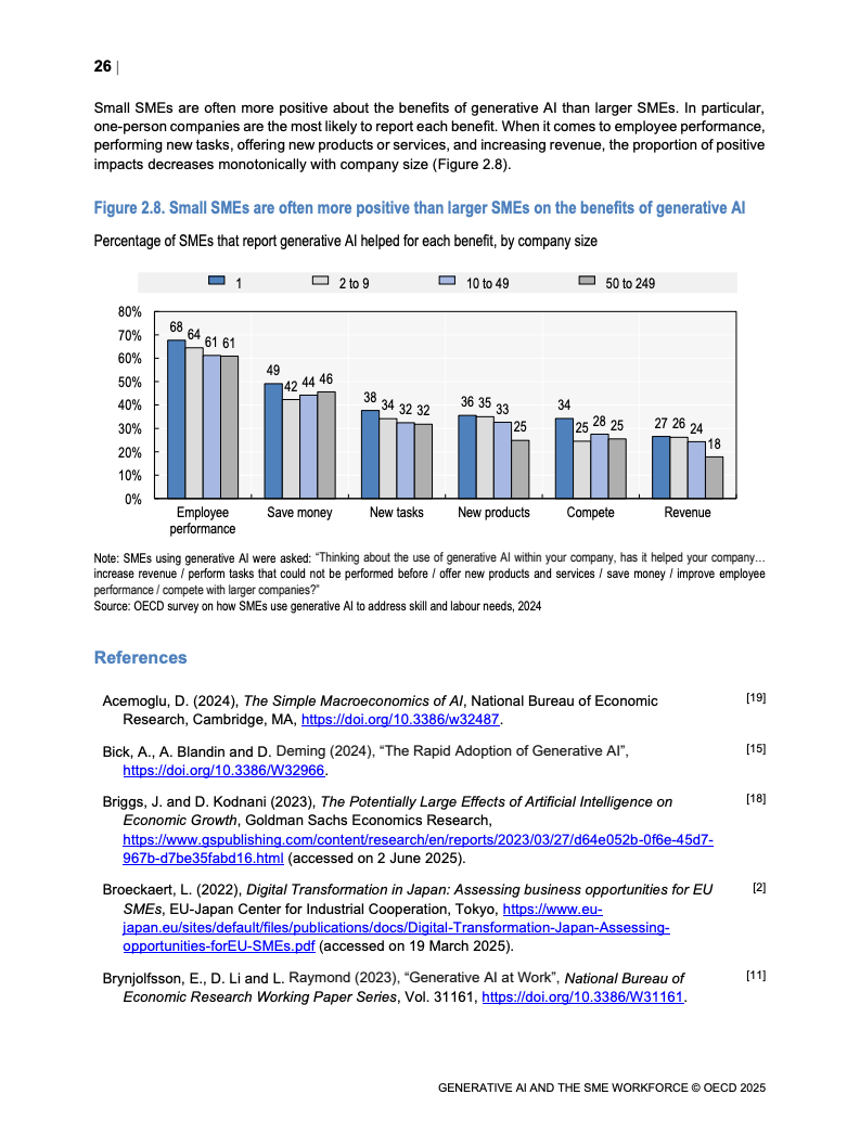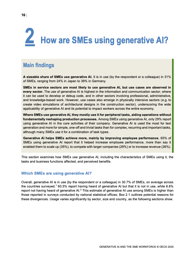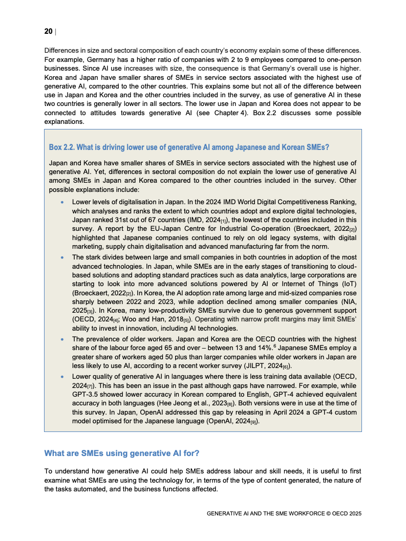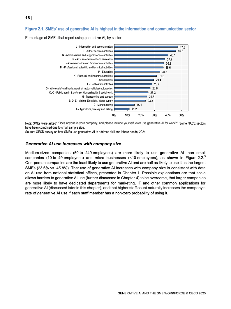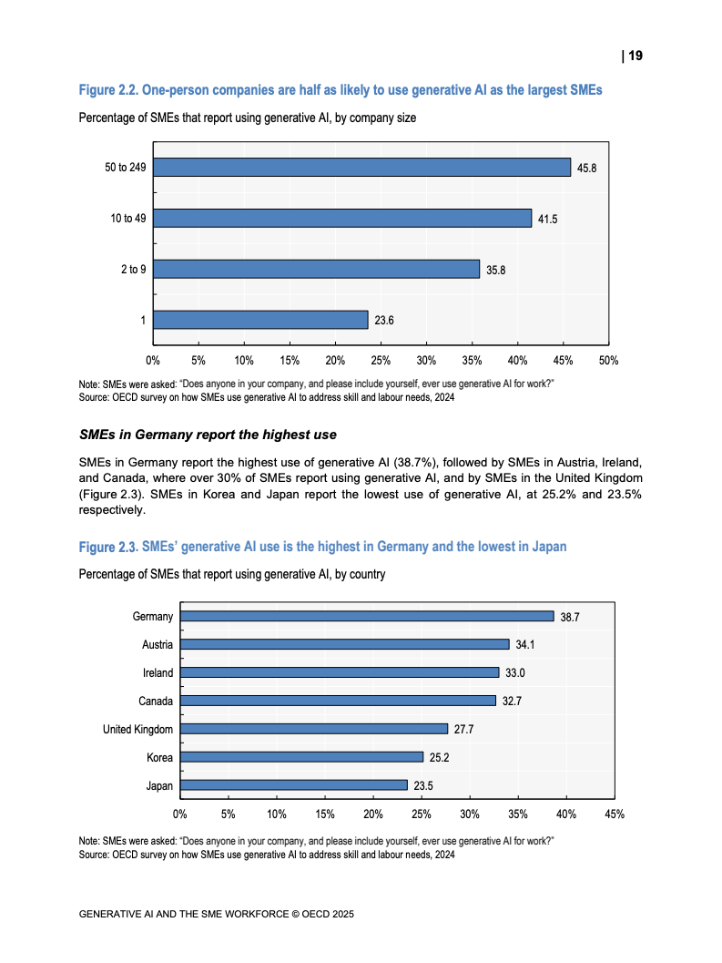 2025年,31%的中小企业已在日常工作中使用生成式AI,欧洲国家中德国应用率最高达38.7%,而日本仅为23.5%。从行业分布来看,信息通信业使用率达47%,农林渔业仅11%;规模上,50至249人中型企业应用率为45.8%,一人公司仅有23.6%。