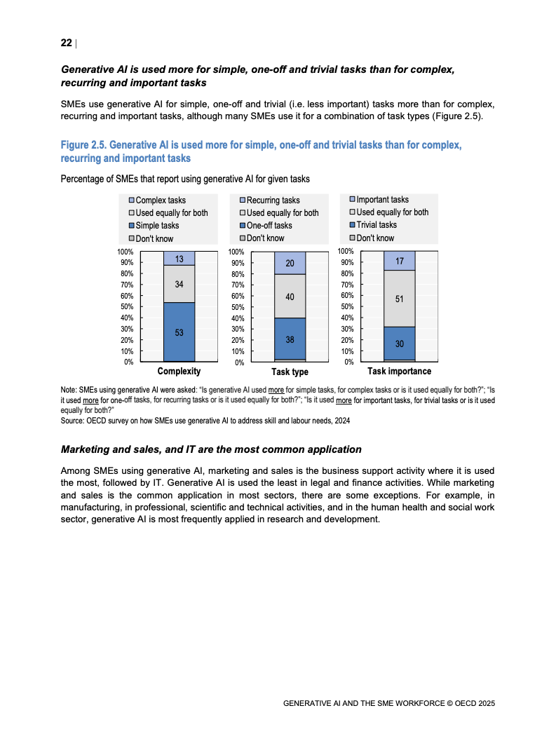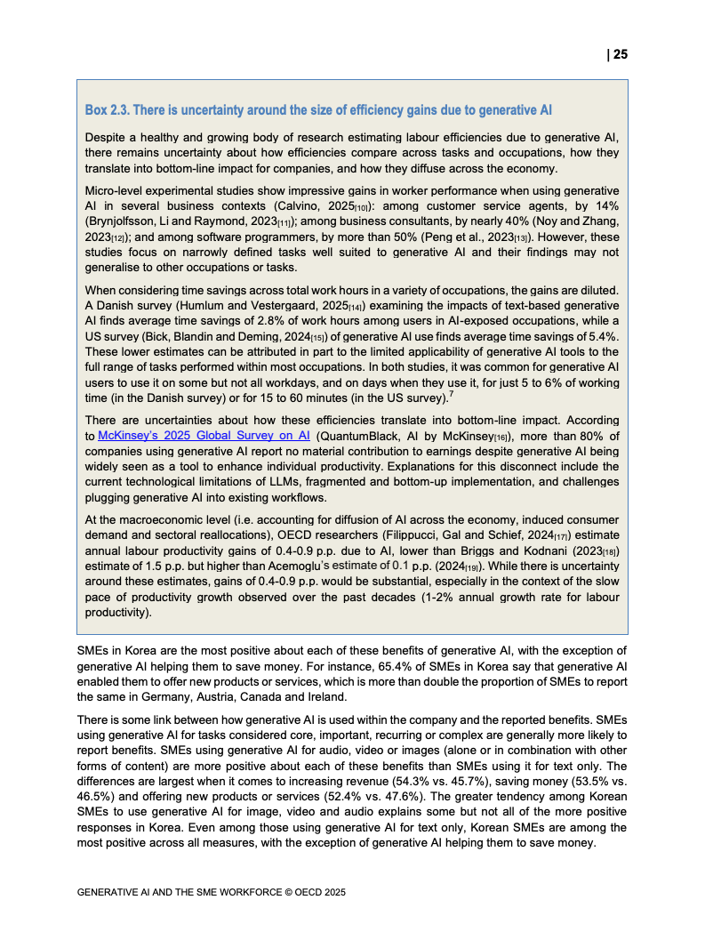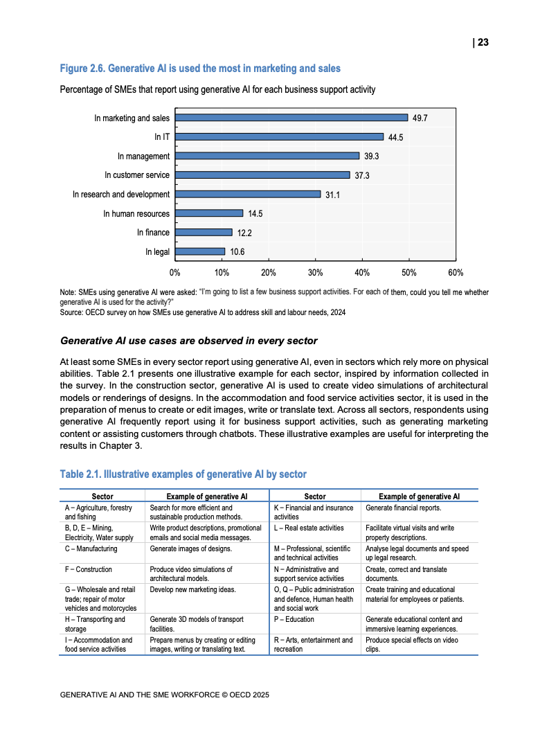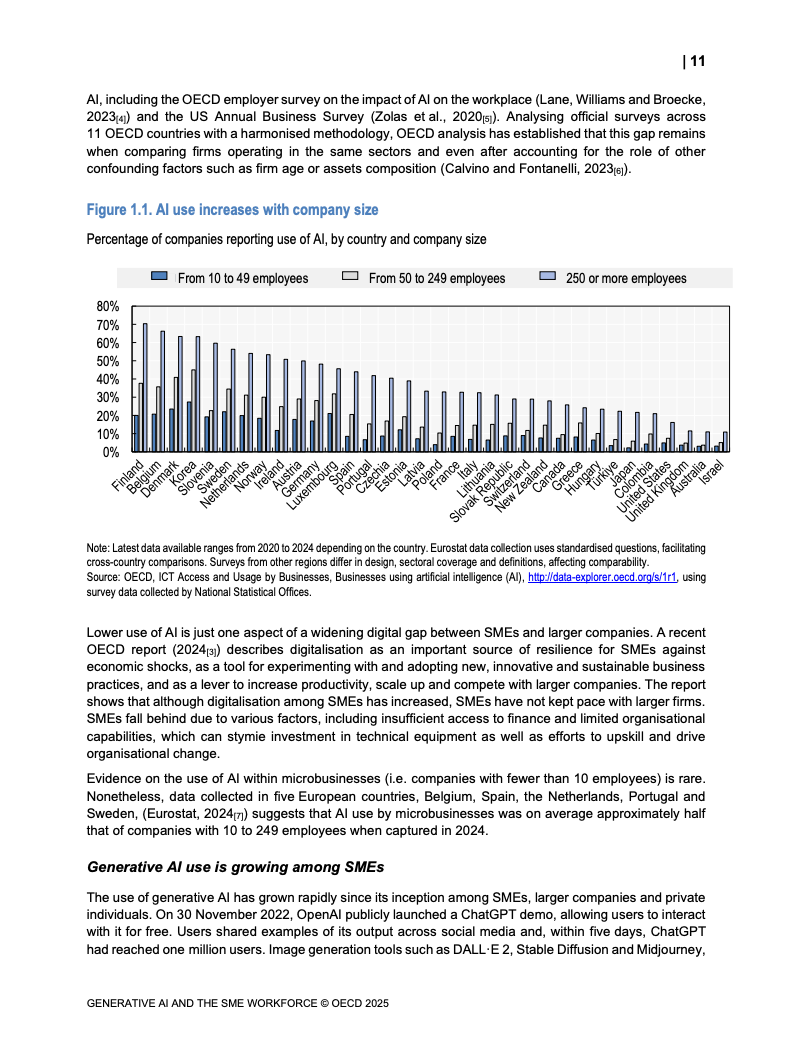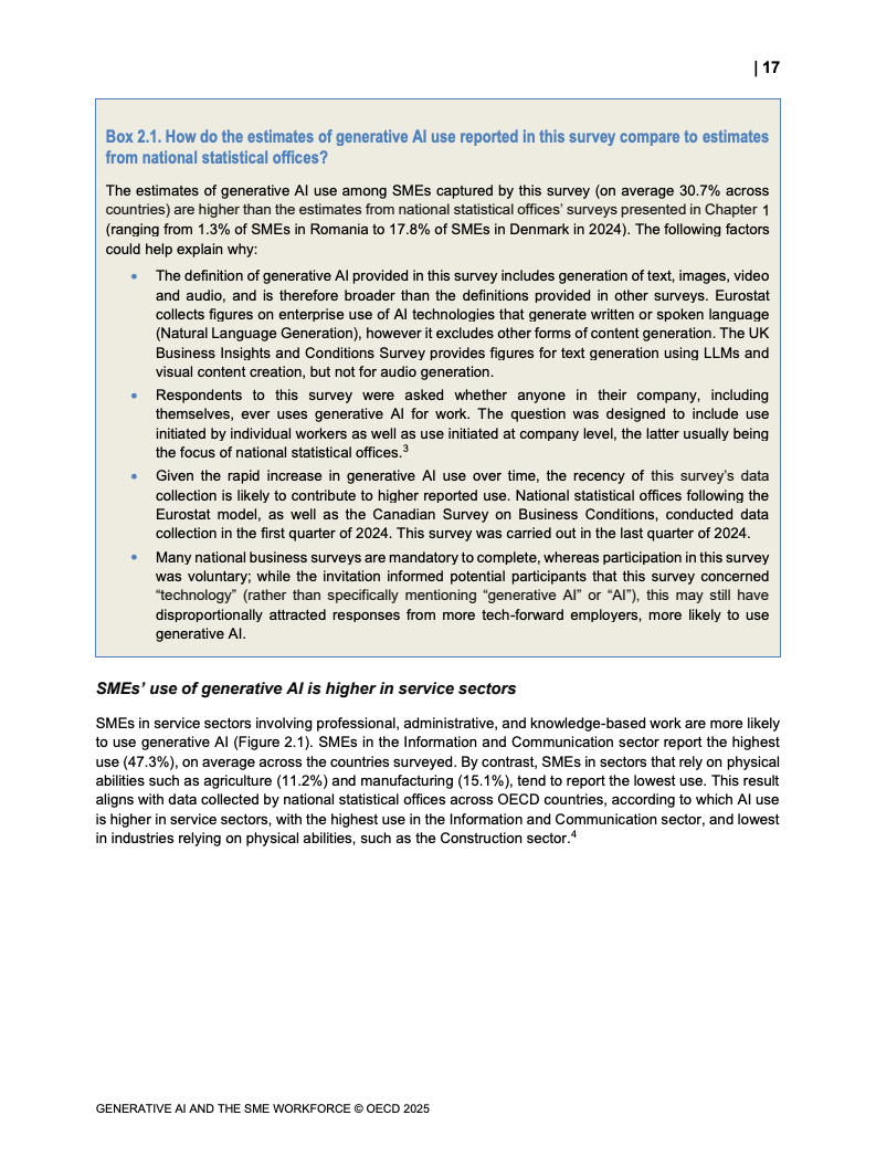 2025年,31%的中小企业已在日常工作中使用生成式AI,欧洲国家中德国应用率最高达38.7%,而日本仅为23.5%。从行业分布来看,信息通信业使用率达47%,农林渔业仅11%;规模上,50至249人中型企业应用率为45.8%,一人公司仅有23.6%。