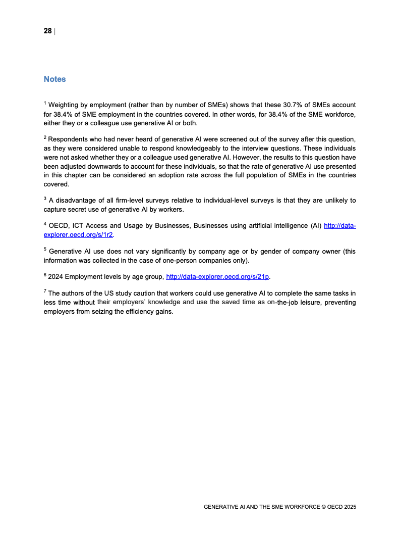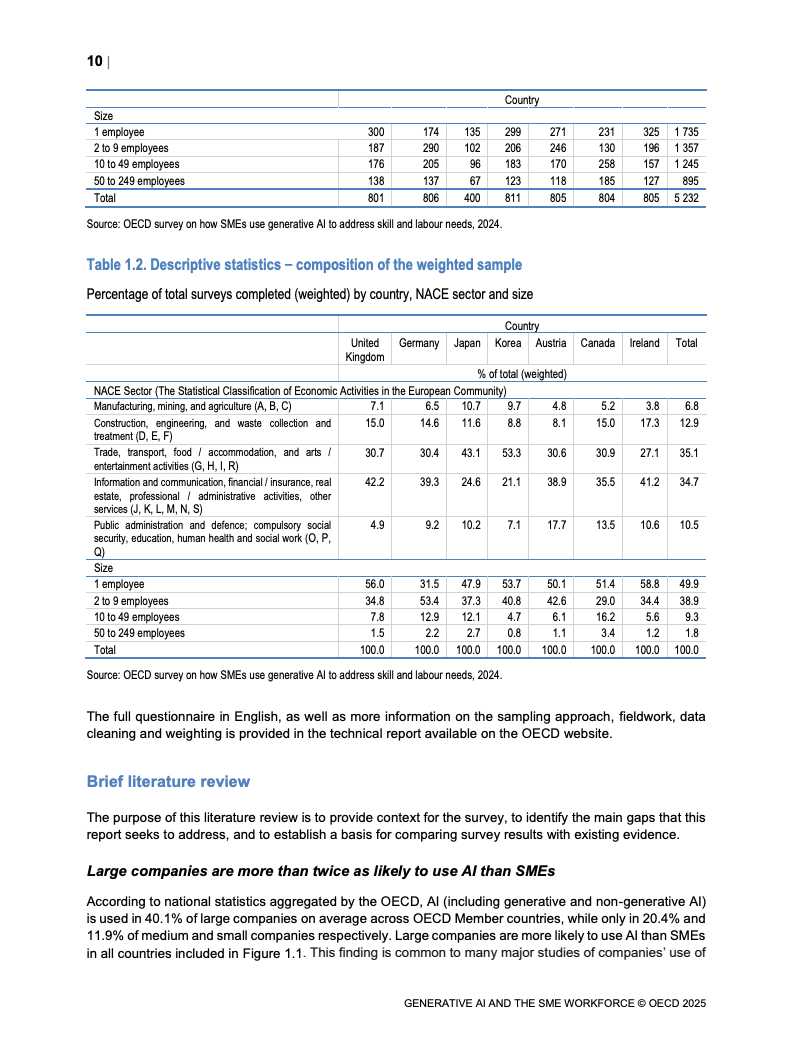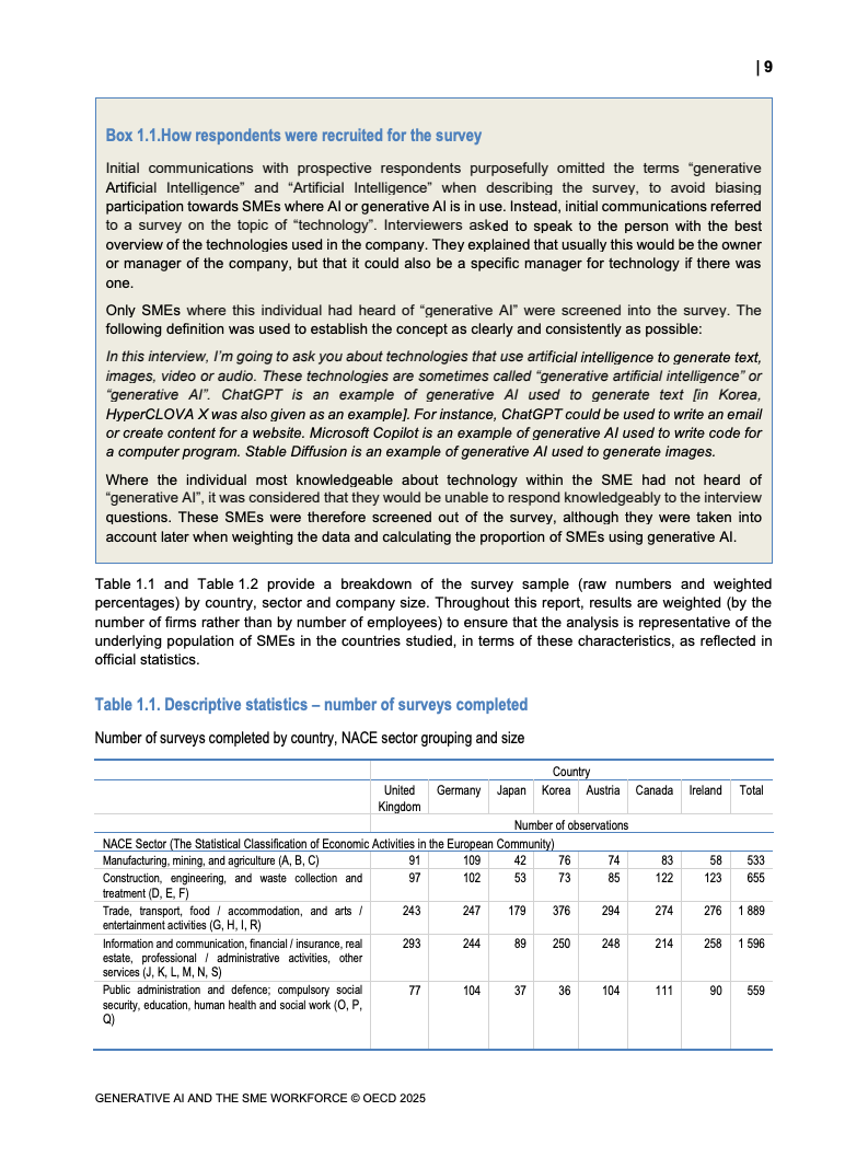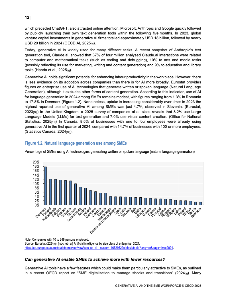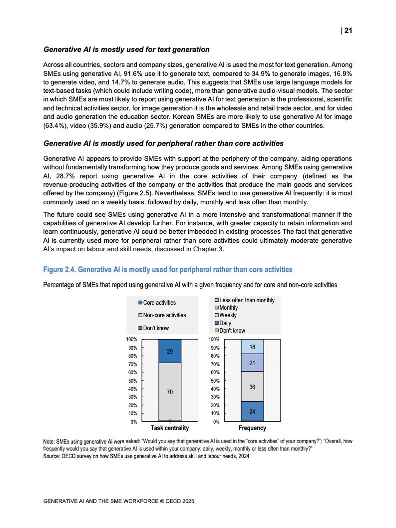 2025年,31%的中小企业已在日常工作中使用生成式AI,欧洲国家中德国应用率最高达38.7%,而日本仅为23.5%。从行业分布来看,信息通信业使用率达47%,农林渔业仅11%;规模上,50至249人中型企业应用率为45.8%,一人公司仅有23.6%。