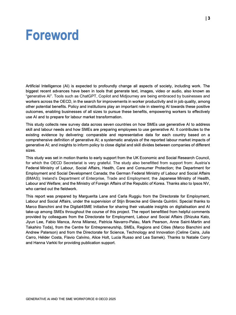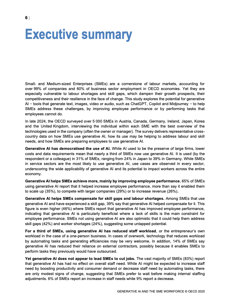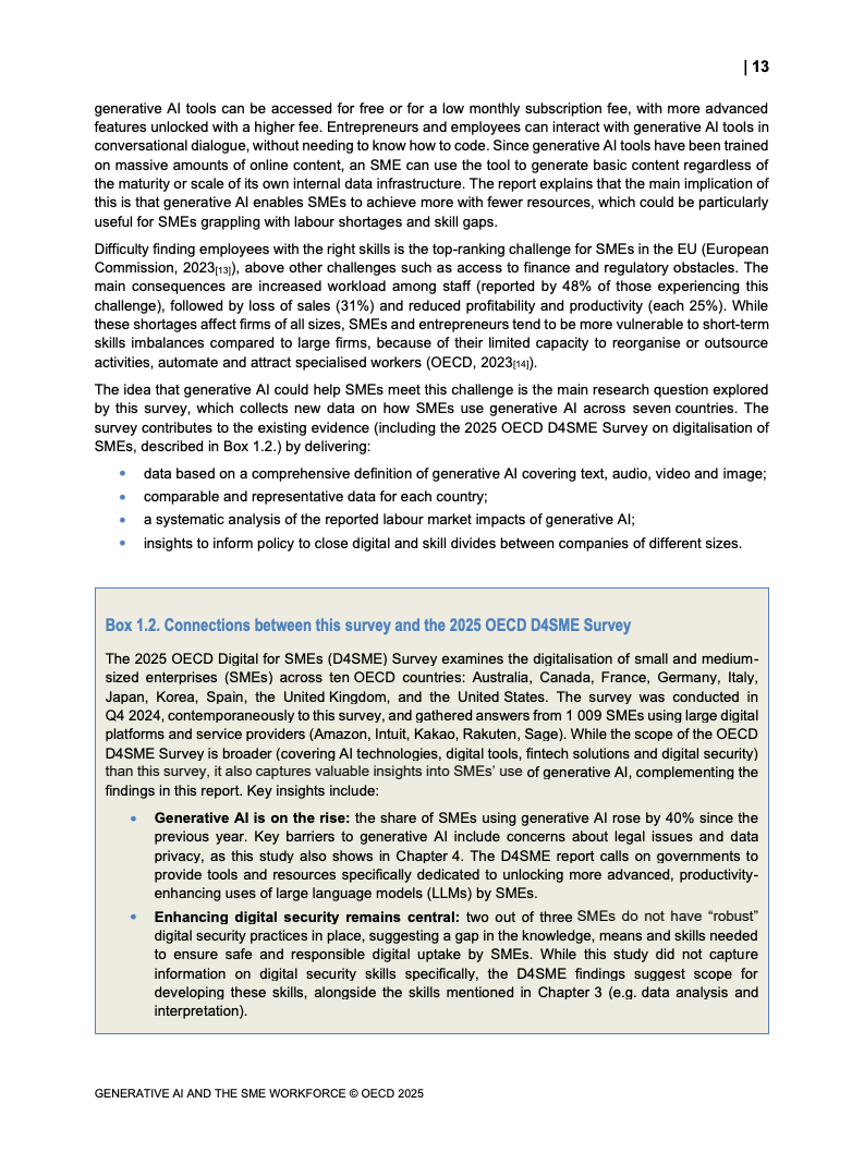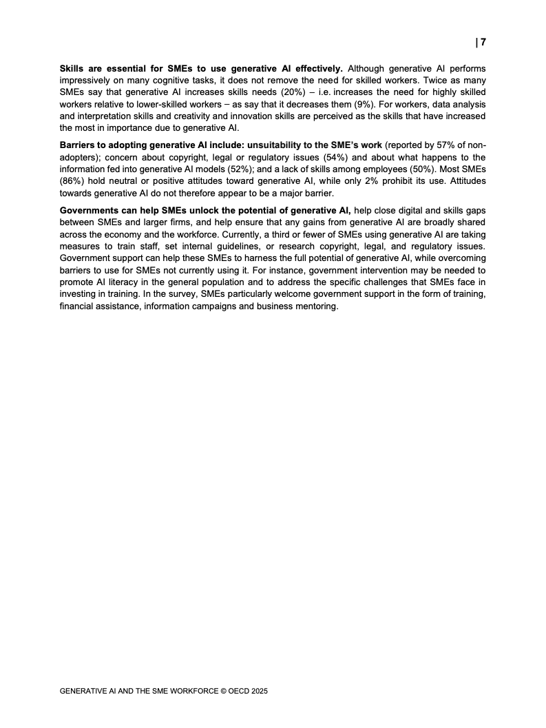 趋势洞察方面,报告认为生成式AI进入“民主化”阶段,低成本和低数据门槛为中小企业带来生产力红利,但深度应用面临技能、法律及治理掣肘。未来企业对高技能劳动力的需求将持续走高,数据分析、创意创新和提示工程等能力成为培训重点,而政府支持和行业组织协作须更聚焦于普惠性培训、合规指引和成功场景复制,以防止数字鸿沟由“有无AI”转向“AI用得好坏”。