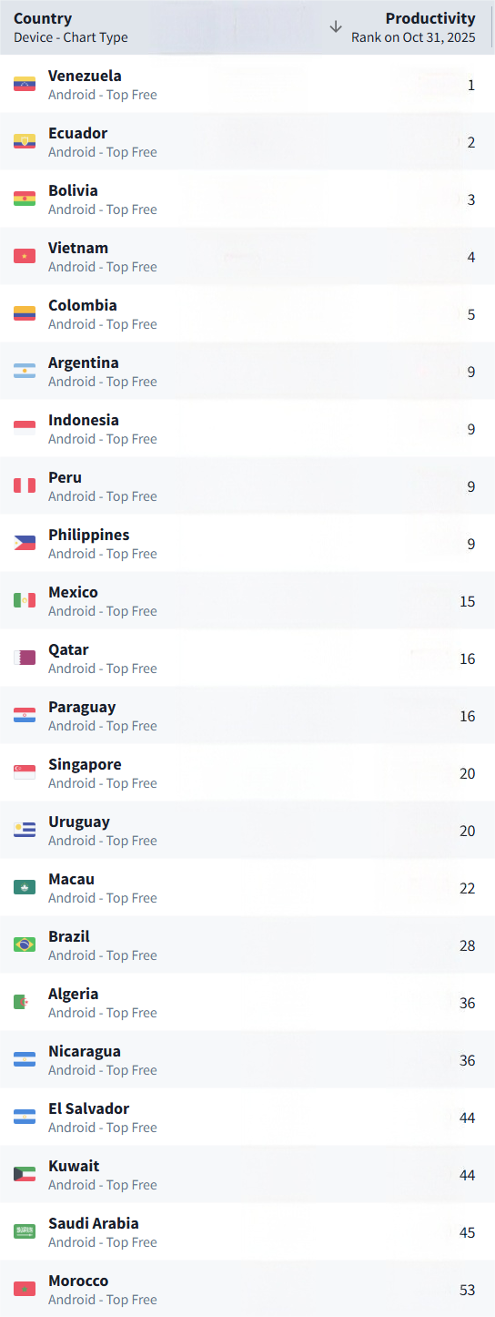 根据第三方数据,Agnes 已多次登上新加坡、越南、印尼、阿根廷等地 Google Play 效率榜前十,显示出其在新兴市场的广泛认可度。