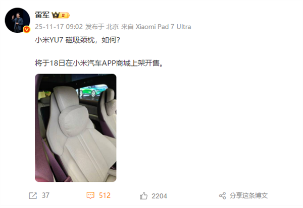 快科技11月17日消息,今日上午,小米集团创始人、董事长兼 CEO 雷军宣布:小米 YU7 磁吸颈枕将于 18 日(即明天)在小米汽车 App 商城上架开售。
