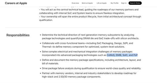 苹果公司正在招聘DRAM封装工程师,其技能要求中明确列出了对CoWoS、EMIB、SoIC以及PoP等多种先进封装技术的熟悉程度。