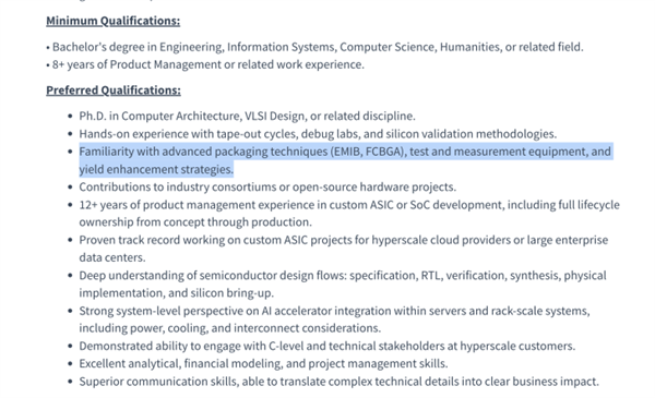 同时,高通资料中心事业部的产品管理主管职缺,也将Intel EMIB列为一项重要的专业技能。