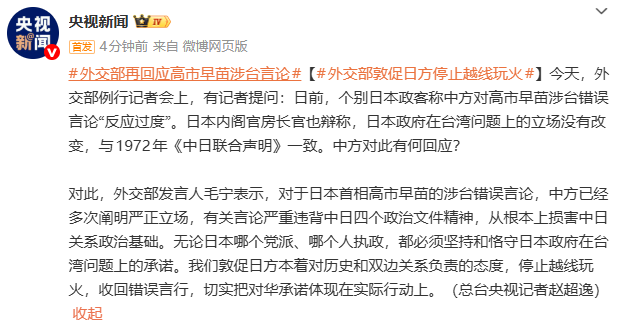对此,外交部发言人毛宁表示,对于日本首相高市早苗的涉台错误言论,中方已经多次阐明严正立场,有关言论严重违背中日四个政治文件精神,从根本上损害中日关系政治基础。无论日本哪个党派、哪个人执政,都必须坚持和恪守日本政府在台湾问题上的承诺。我们敦促日方本着对历史和双边关系负责的态度,停止越线玩火,收回错误言行,切实把对华承诺体现在实际行动上。(总台央视记者赵超逸)