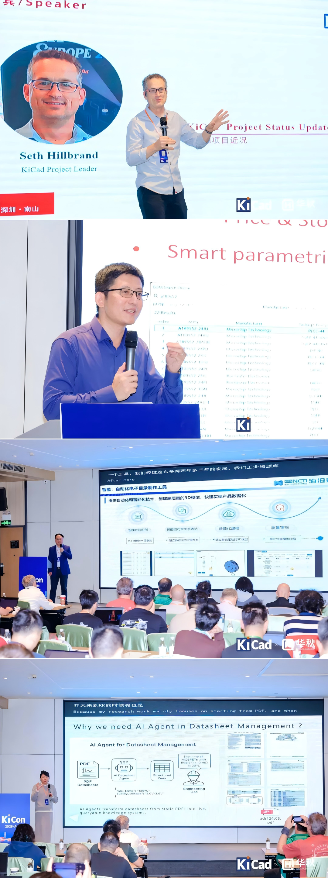 1. KiCad项目近况及更新:Seth Hillbrand、2. 华秋发行版AI Copilot 与云端库实践:Hubert Hu、3.共筑产业基石,赋能制造未来——国创基础资源库与华秋KiCAD的共赢之举:田怀俊、4.AI Agent:电子设计效率革命的下一站:吴绿