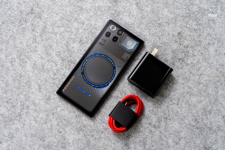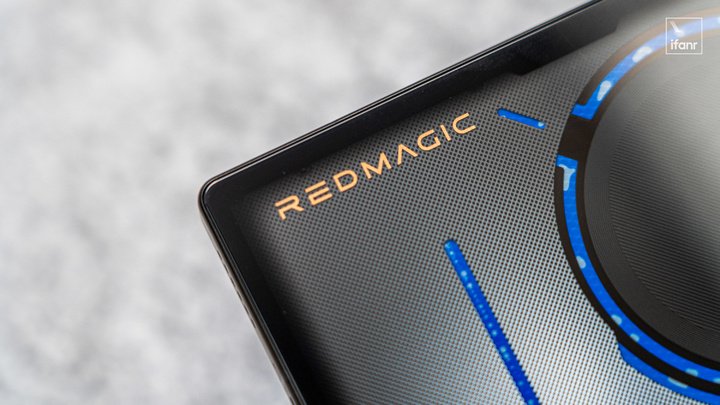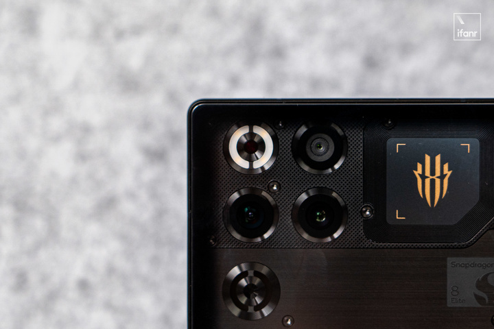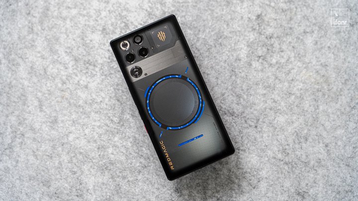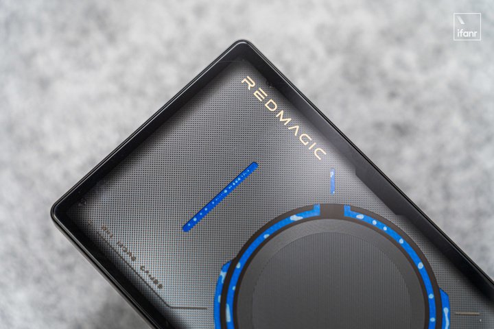 后置摄像头和散热风扇以四方排列的在后盖左上侧,左上侧环形补光灯中心内置了红外传感器,可用于模拟遥控控制家电。风扇、红魔 LOGO 以及侧边电竞模式 LOGO 和触控肩键都附带了灯条,进入游戏模式、快充、消息提醒都会有对应的灯效。