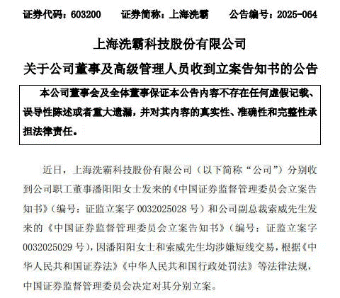 “短线交易”在A股并不鲜见,但一次两位高管同时被立案,仍属罕见。翻阅上海洗霸过往公告,潘阳阳、索威均非公司创始人,亦不在持股5%以上股东之列,平日曝光度有限。