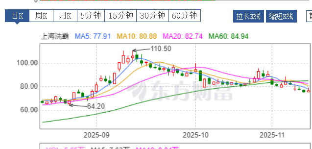 今年以来,随着固态电池概念受到热捧,上海洗霸股价也迎来强劲上涨,并在近期创出历史新高。11月7日,上海洗霸股价来到了82.16元/股的阶段性高点,总市值为144.2亿元,年初至今公司股价涨幅达239.78%。不过最近公司股价下滑,11月12日报75.55元/股。
