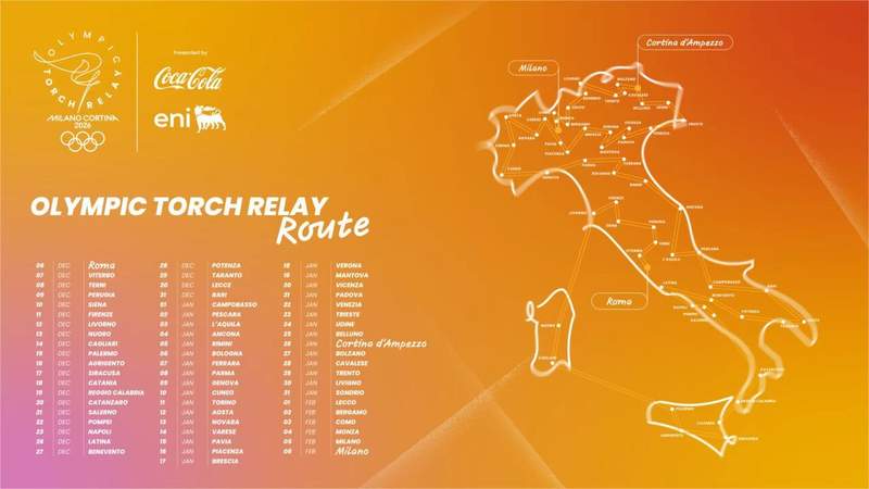 据央视新闻消息,当地时间11月17日,2026米兰-科尔蒂纳丹佩佐冬奥会组委会正式公布了奥运火炬传递的完整路线。根据安排,圣火将在2025年12月6日至2026年2月6日的两个月时间里,沿着一条总长约12000公里的路线,穿越意大利全部20个大区、110个省份,并途经多处世界文化遗产与地标性景观。