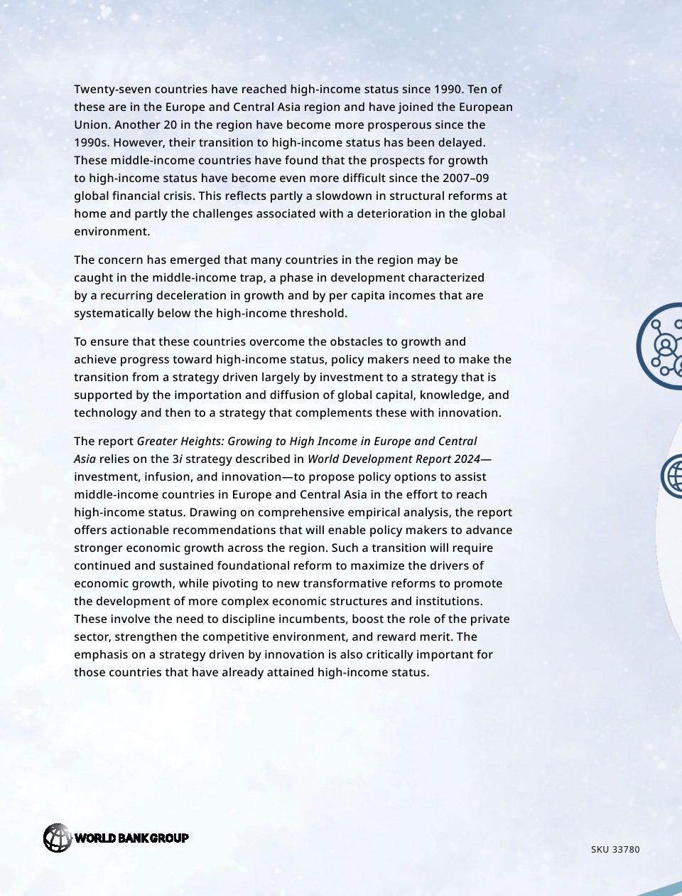 自1990年以来,全球已有27个国家达到高收入水平。这些国家中有10个位于欧洲和中亚(ECA)地区,它们都加入了欧盟(EU)。由于上世纪90年代初开始从计划经济向市场经济转型,随之而来的广泛而深入的结构性改革,以及私人主动性成为增长的主要动力,这些国家的经济增长在本世纪头十年达到顶峰。这些国家成功地接受了欧盟一体化的市场、健全的制度以及改革和重新调整的生产结构,从而实现了向高收入国家的过渡。