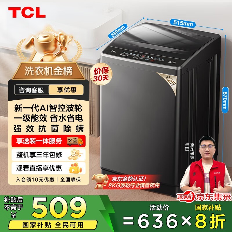 TCL 8 公斤波轮洗衣机 B80L2R 到手 492.8 元