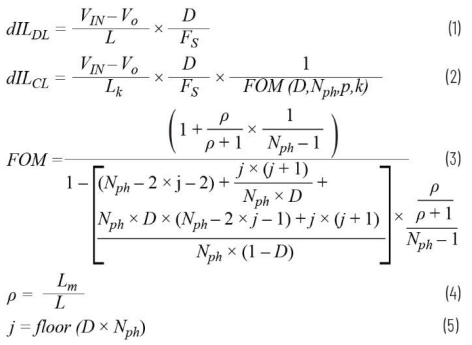 或者,漏感为Lk且互感为Lm的耦合电感中的电流纹波可表示为公式2。1 FOM用公式3表示,其中Nph为耦合相数,ρ为耦合系数(公式4),j为运行指数,定义了占空比的适用区间(公式5)。