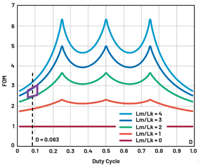 图2.针对一些不同Lm/Lk值,4相CL的FOM与占空比D的函数关系。突出显示了目标区域。