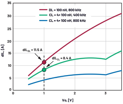 图4.VIN = 12 V条件下,DL = 100 nH (800 kHz)和CL = 4× 100 nH (800 kHz, 400 kHz)时的电流纹波与VO的函数关系。