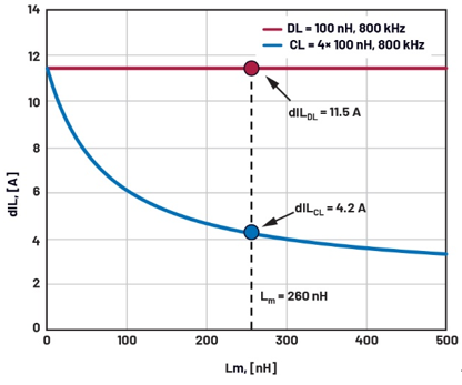 图3.VIN = 12 V、VO = 1 V且Fs = 800 kHz条件下,DL = 100 nH和CL = 4× 100 nH时的电流纹波与Lm的函数关系。