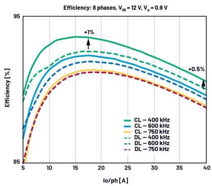 图7. 8相DL = 100 nH(虚线)和采用统一封装策略的2× CL = 4× 100 nH(实线)设计的测量效率比较,VIN = 12 V,VO = 0.9 V。