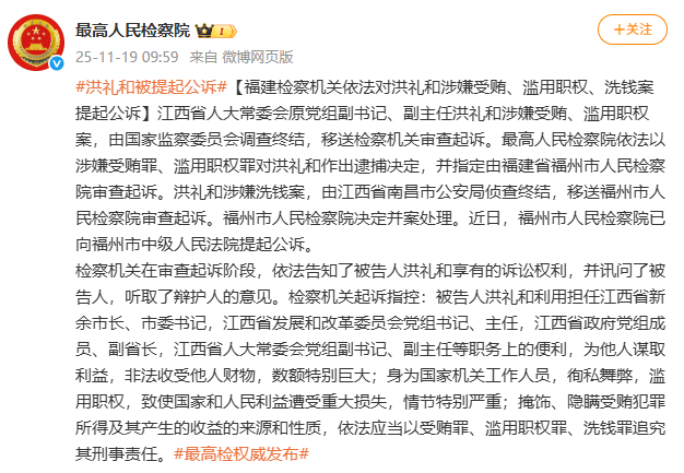新京报讯 据@最高人民检察院 微博消息,江西省人大常委会原党组副书记、副主任洪礼和涉嫌受贿、滥用职权案,由国家监察委员会调查终结,移送检察机关审查起诉。最高人民检察院依法以涉嫌受贿罪、滥用职权罪对洪礼和作出逮捕决定,并指定由福建省福州市人民检察院审查起诉。洪礼和涉嫌洗钱案,由江西省南昌市公安局侦查终结,移送福州市人民检察院审查起诉。福州市人民检察院决定并案处理。近日,福州市人民检察院已向福州市中级人民法院提起公诉。