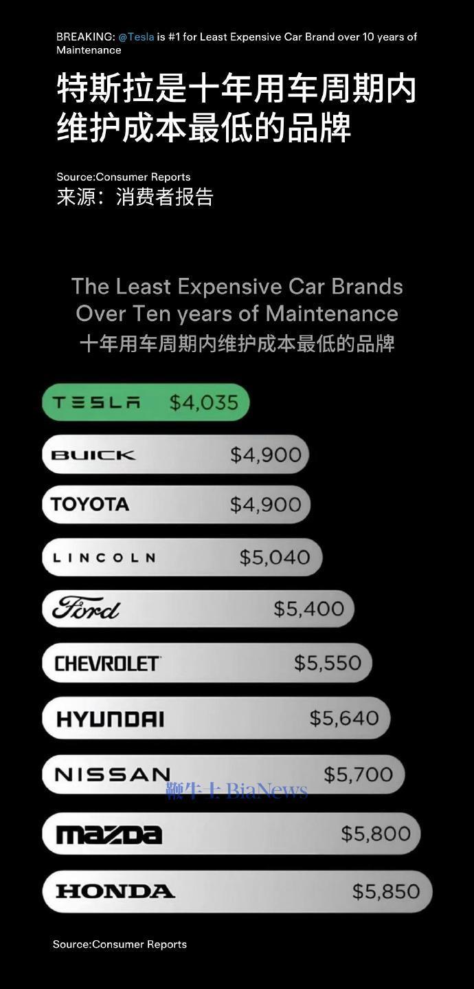 调查显示,在10年用车周期内,特斯拉是维护成本为4035美元,为成本最低的品牌。
